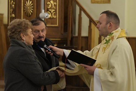 Obchody rozpoczęły się uroczystą Mszą Świętą w kościele pw. Św. Apostołów Piotra i Pawła, podczas której Jubilaci dziękowali za lata spędzone razem. Liturgia miała wyjątkowo ciepły i osobisty charakter dzięki zaangażowaniu przyjaciół – 3 koleżanki i kolega Halinki i Waldka, przygotowali oprawę Mszy, czytając Słowo Boże, prowadząc modlitwę wiernych oraz wykonując psalmy. Ich śpiew i obecność nadały nabożeństwu szczególnie podniosły, a jednocześnie rodzinny nastrój.